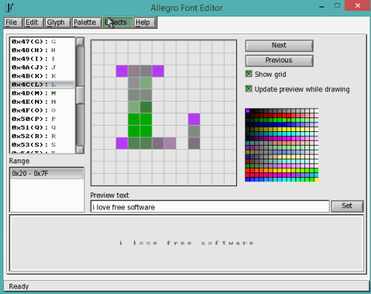 Allegro Font Editor is another good font editor in this list. You can open Bitmap fonts, Windows fonts (*.fnt and *.fon), TrueType fonts, CFF fonts, and more. After opening a font, you can remove any block (say pixel) from a particular letter, or can fill the blocks with desired color. You won’t find advanced tools to edit your font, but it is good to perform basic editing.