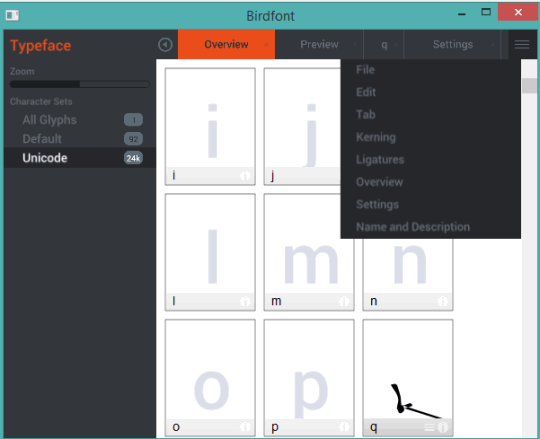BirdFont is also a useful font editor that comes with multiple tools. It provides drawing tools (to add new points, freehand drawing, move control points, etc.), background tools to set background image size, contrast, threshold, etc. You can also preview the whole font before saving to PC. It can also automatically generate *.ttf file, SVG file for font, and can save font to its native format (*.bf).