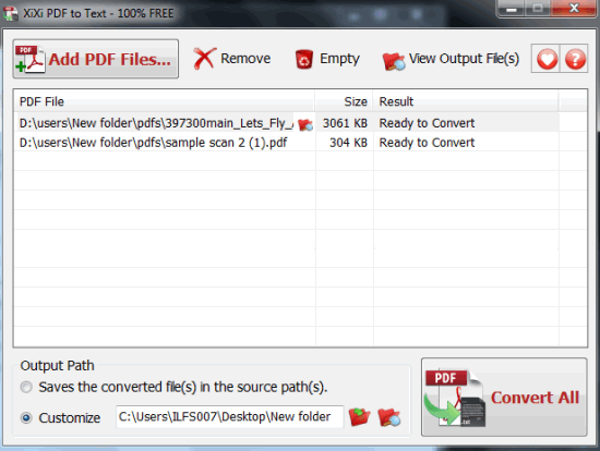 XiXi PDF to Text is a freeware to bulk convert PDF to text files. It also lets you set destination location of your choice to store output text files. Whenever you need to extract text content from a PDF file (that includes charts, images, etc.), this software will be handy to use. This software provides a very fast and straightforward way to fetch text from multiple PDF files.