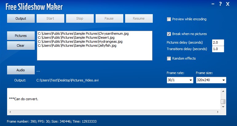 Go over the transition delay and effects settings on the right. You can only set the transition and effects delays, you can’t select effects which are gonna be used. They are gonna be selected at random, or in certain order if you uncheck the Random effects box. Set the Frame rate, Frame size, and lastly click on Output to select the place where the video slideshow is gonna be saved. Once you do that, Start button will become clickable. Click it and selected images are gonna be converted.