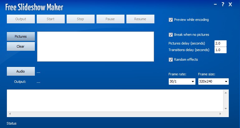 Interface of Free Slideshow Maker can be seen in the image above. It’s very simple, all the options are laid out right away, you don’t have to go through any kind of menus. The five buttons at the top represent the steps that you need to go through before AVI video slideshow can be created. On the right side you can adjust transition effects, delay, and so on. White empty area in the middle is where image and photos that you select are gonna be placed.