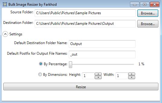 Everything that you need to know about how to use Bulk Image Resizer has already been explained. Run it by clicking on the executable, and then set the source and destination folders using the Browse buttons in the top right corner.