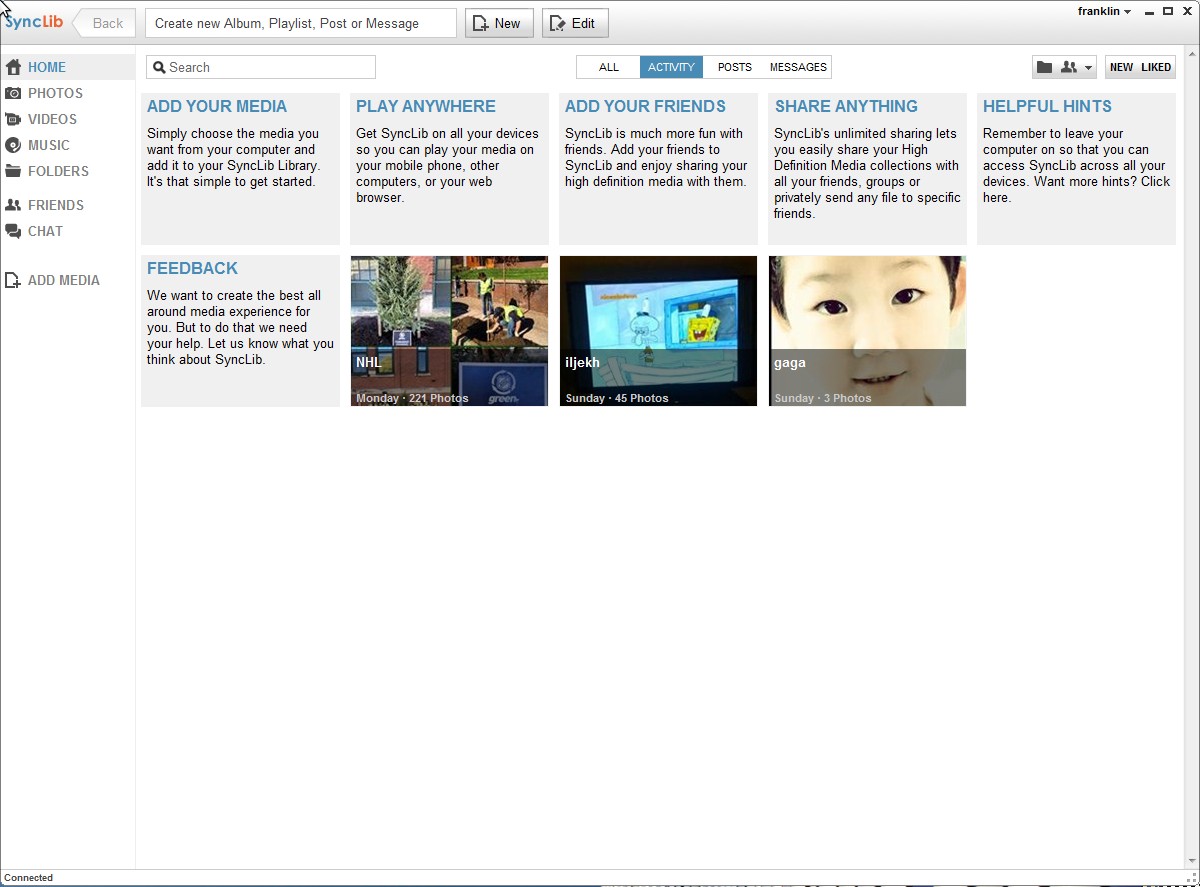 This would be the default interface of the desktop application. Here, you can select which folders you want to share, and you can even add your social network contacts to share files with them as well. Click Add Your Media button to start opening up additional files, default folders for images, videos, documents, music are gonna be loaded automatically. Files are still not shared though, to do that, hover your mouse over folders, documents, music or whatever you want to share and you should see an option to Share, click it and confirm the selection.