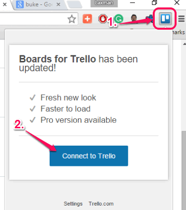 Grab the homepage link of this Chrome extension and install it on your browser. After installation, you will find its icon on the top right side, next to address bar. This icon is used to open the pop-up of this extension. Moreover, it will also show the total number of unread notifications count, but first you have to connect your Trello account with this extension and authorize it to access your account. So click the extension icon to open the pop-up and connect your account.
