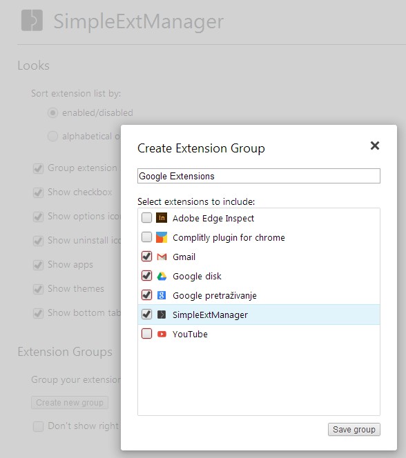 The most important thing which you should be focusing on are the extension groups. Notice in the background of the image above, they are located all the way at the bottom. This is where you can create a group for extensions that you want to turn off all at once. There you can also select if you want the enable/disable options available, if you want uninstall buttons available and several other settings.