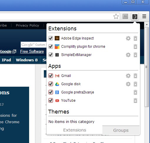 SimpleExtManager is a free Chrome extension Manager which you can use in order to quickly and easily enable or disable extensions that you have installed on Google Chrome, to remove/uninstall them. You can even group extensions together and then turn off several of them at the same time and the best part is that you can do all of these things right from your toolbar, without opening any kind of menus.
