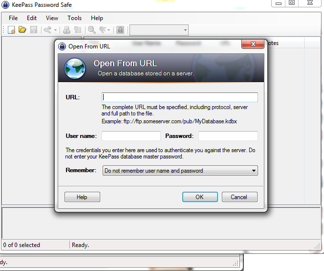 When you start working through this software you are provided with a software named “keepass password safe.” Here you can access your database of your protected files and passwords. The main screen of the software has title, user name, password, url and notes of your data stored. If you want you can create a new database by going in the files menu and clicking on “open file” or “open URL.”