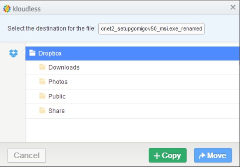 To transfer images and photos from received emails, you’re gonna have to select the Copy/Move options, which will be available next to the standard Download. Once again, a window will pop-up where you’ll be able either copy or move your files. The difference is of course that when you select copy, file is left intact in the attachments, but when you select move, it’s removed completely from your Gmail account and moved to the selected cloud hosting service.