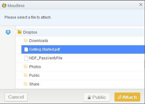 On the second screenshot from the top, you can see the Kloudless icon. When composing email, click on it and you’ll be able to access connected cloud hosting services.