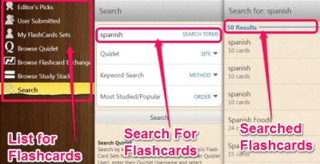 Here you can browse, search and save the flashcards in this section. Quizlet, Study Stack are some of the websites that provide the flashcards. You can also browse to flashcards that other users have uploaded. The searched flashcards will be displayed on the right side of the image. To install a particular flashcard set you have to click on the flashcard set from the searched result and then select install set, which is on bottom right of the screen.