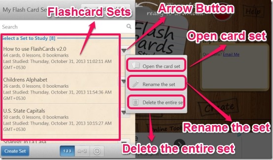- Open the card set – It opens the flashcard set. Alternatively, you can simply click on the flashcard name to open the flashcard set.
