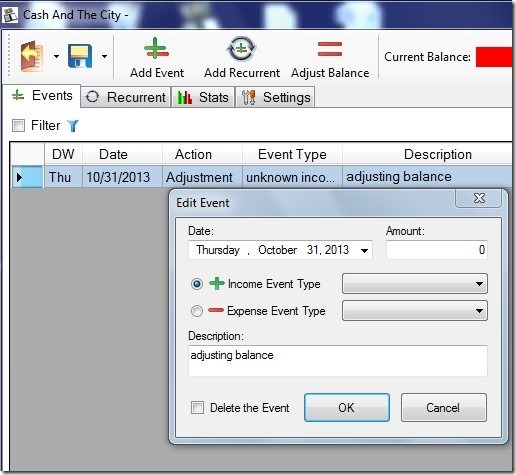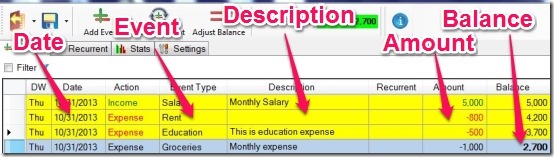 Cash and The city is Free software for Money Management. In Cash and the city you can organize your earning and expenses in form of tables and charts. The table can be exported to an Excel sheet or it can be imported from an excel sheet document. You can also view the balance amount calculated from the table of the events. I have tested the Cash and the city software and here is the screenshot below for the table I have created for the expense and earning.