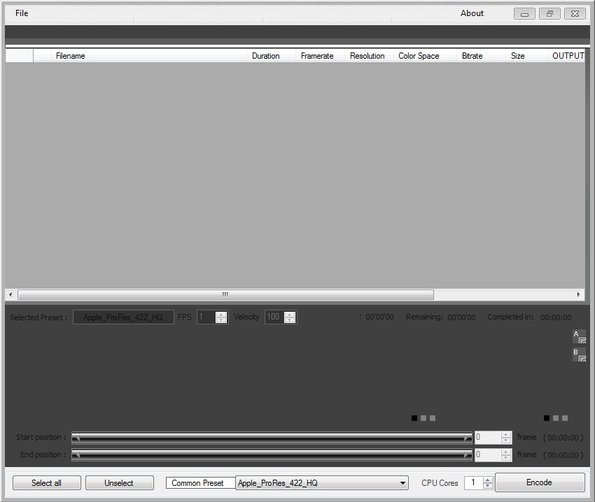 Without any videos added to the conversion list at the top, interface of Cinec looks like it doesn’t have much to offer. At the bottom you can see that there’s video timeline sliders, two of them, one for setting the start and another for the end point of the section of the video that you would like to cut out.