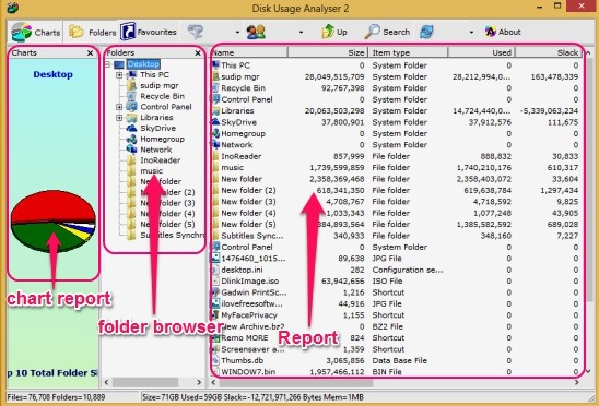 Disk Usage Analyzer is a handy freeware and does helps in finding out the files/folders that are occupying more space in your drives and making the system slow. Using it, you can you can find these big sized files in just one click and then send these files to external storage spaces from within the freeware, itself. It’s simple, easy, and quick. It automatically analyses folder/drives, the moment you click on them from the list shown inside Folder Browser pane or Charts pane. It provides an interface that’s too easy and fast to work at. All necessary buttons for analyzing folder and drives are right on the interface. Simply launch this disk space analyzer, and it automatically runs a full system analysis scan. It then shows the result in form of detailed report that contains: Name, Size, Item type, Used space, Slack space, date created, date accessed, date modified, access availability, attributes and number of contained files and folders.