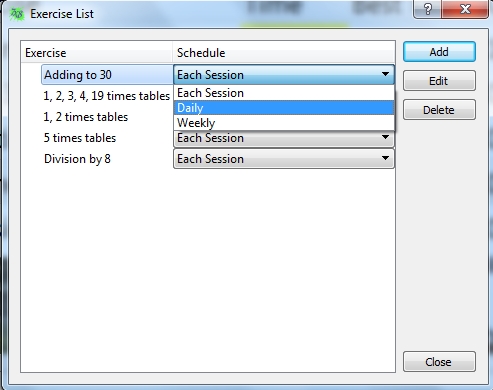 The very first time you lunch JXCirrus Maths, you will be prompted to set up some initial exercises. You can click on the “Add” button, select the type of exercise you want to set for your child, the range of numbers you want to include in the problems, order of questions, and the number of questions to be asked in the exercise.