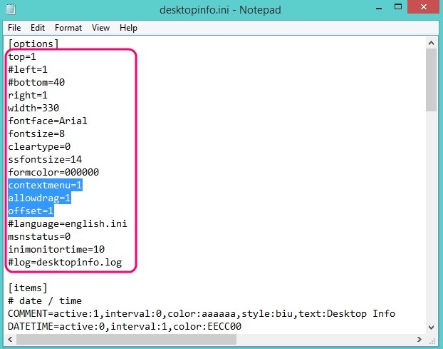 Simply click on Configure option. This opens the actual freeware configuration file (desktopinfo.ini) in notepad. The settings look techy, still, you can change some basic but main settings by editing the values of attributes, that come under [options] tag. This tag contains attributes for alignment, font style, font size, background color, context menu’s visibility, allow dragging to reposition feature, time interval for checking the source configuration file for changes, and the log file where the debug information gets written.
