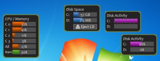 As soon as you install UsefulGadgets in your system, they will automatically get added to the Windows 7 Gadget gallery from where you can easily launch the gadgets of your choice. These gadgets will appear as tiny windows showing information on CPU activity, disk space, and disk activity in bar graph form.