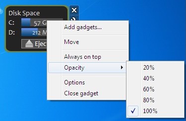 Apart from that, there’s a “Settings” button that opens links to third party websites and similar software from the SD Software (parent website of UsefulGadgets); something which is not related to any kind of gadget’s settings. But if you right-click on the gadget interface, a context menu will open that lets you set the gadget to be on top always or change its opacity.