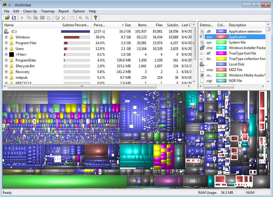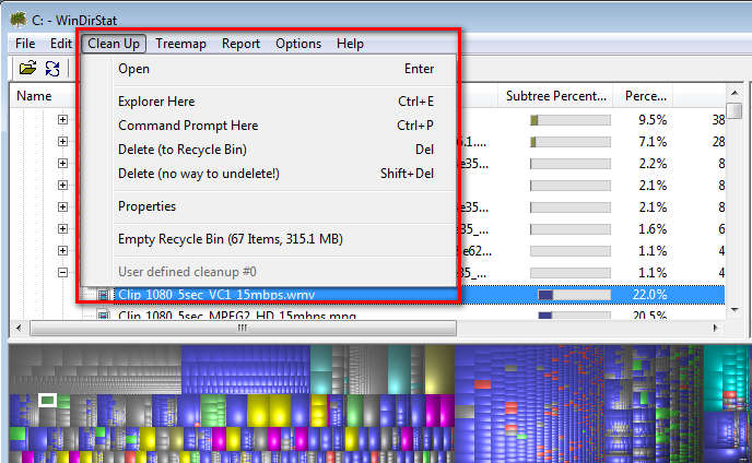 Disk cleanup which is offered by WinDirStat is only gonna delete files from the Recycle Bin, but if you’re not recycling for a long time, a lot of disk space can be eaten up so Recycle Bin cleanup offered by WinDirStat isn’t such a bad idea. What’s more interesting are all the pretty colors which you can see in the bottom part of the screenshot above, which is the graphical display of disk usage.
