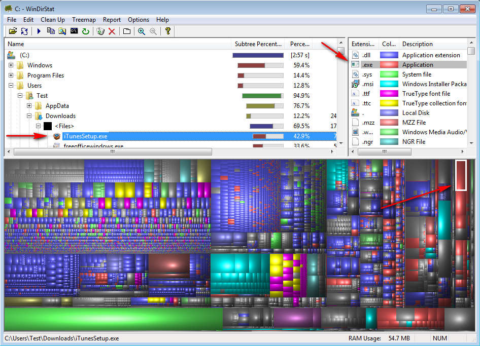 Each file extension will get it’s own color, as you can see red is the color of .exe files, which are applications. When you select the application extension in the upper right corner all of the red squares on the map below are gonna be marked. Selecting only one square is gonna open up the file that’s behind the square in the tree directory list on the left, where you can read precise size information about that particular file.
