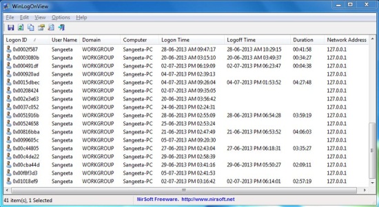 WinLogOn View is a free software that displays logon session information of all users on Windows PC. It’s a handy and reliable tool that analyzes the Windows Security Log and identify date or time when users logged on or off on Windows. WinLogOn View displays information including the logon ID, user name, logon time, logoff time, duration, domain, computer, and network address, and allows exporting this data to spreadsheet (tab-delimited, comma-delimited), html, or xml format.