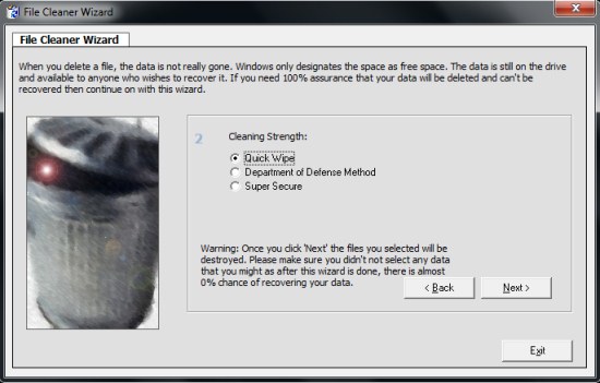 - Choose the desired cleaning strength: Sure Delete offers different methods to destroy files from your hard drive. It supports FAT32, FAT16, FAT12, and NTFS formatting techniques. Each method offers a particular cleaning strength for the files. Choose the desired cleaning strength and click on “Next” button.