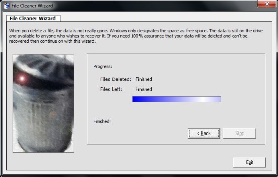 - Delete Files: When you click next, the files will be destroyed permanently from your system, leaving almost 0% chances for recovery.