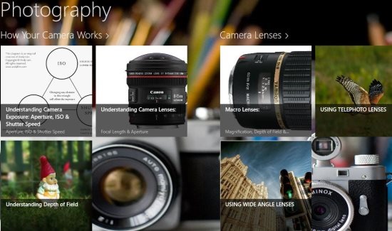 Learn Photography is a free Windows 8 photography app; using which you can learn photography tips and enhance your photography skills. This app is available in the Photo category of Windows 8 app store. This app explains how to use cameras, how to take clear shots, about lenses, filters, etc. If you are willing to learn photography or own a camera DSLR camera or you want to learn some cool tips on photography, just install this app on your Windows 8. Learn some cool features of cameras and how to use them, with this photography app.