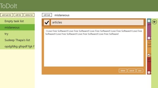 The app’s interface is pretty well laid out. All the task lists gets listed at the left side of screen. Above these task list there are buttons for managing the task lists. The buttons include: Add Task List, Edit List, and Delete List. There’s no character limit for the task list name, task name, and task details/content. So you have all the freedom to give as much details as you want.