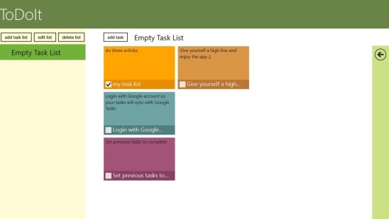 ToDoIt is a free Windows 8 to-do list manager app. Using this app you can plan and then list out all the important things that you wanted to do today or in near future. It is a simple and effective productive everyday tool and stops you from missing out or forgetting stuff. It helps you manage your daily chores by listing them under different task lists called Bucket List. Besides that, this Windows 8 to-do list manager app also lets you connect it with your Google account so that you can integrate it with Google Tasks.