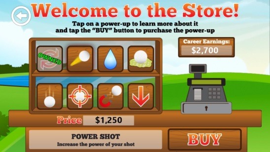 So the game starts in the Evergreen Links course of Eagles Highlands world. You have to complete a course in order to unlock and advance to next course, and complete a world to advance to another world. In each of the course you’ll get a given number of holes (rounds), for example the first two initial courses has 9 holes. Put the ball inside the hole in given number of pars. If you manage to do that then you’ll get points added to your score in current course, and if you took more strokes then negative points gets added to your score. Completing each course, gives you Cash as the reward. You can use this reward to buy powers that can help you in putting ball in hole quickly.