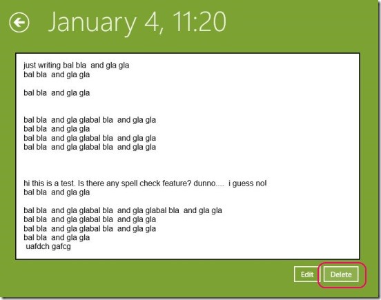 The app gives you a plain slate to write on. But, it does lacks the spell check feature. Still, there are other good features in the app. There’s no word limit, and you can use the basic cut, copy, paste, and select all options. Once you are done writing the note, click on Save button. The app save and arranges the entries on date basis. It automatically assigns the date and time, when the entry was made and then, shows the latest entries first in the list, and older the last.