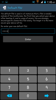 - Once you are done with the above, the application will ask you for a Default PIN. This will be used outside the lockscreen, or in case of errors. Enter and re-enter the PIN; the longer the better.