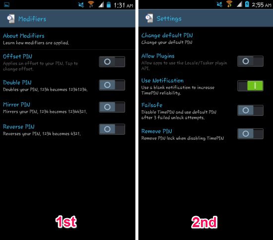 - If you feel that this is too simple and you like to make it more secure, then don’t worry; TimePIN for Android comes with plenty of options to resolve this issue. Click on the ‘Modifier’ and you will have the window as seen in the 1st screenshot below. Now you can double, reverse or mirror the auto generated PIN. Double pin will mean you will need to enter same pin twice. So, instead of 1234, you will enter 12341234. Mirror Pin means you will first enter the pin, and then re-enter in reverse. So, 1234 will be 12344321. And Reverse Pin simply means you will enter the pin in reverse. So, 1234 will be entered as 4321. Clicking on ‘Settings’ from the main interface will bring you options as shown below in the 2nd screenshot. Here you can change the default PIN or mess with the other settings.