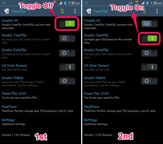 - Now that we have reached to the main interface of the application, we have to enable the time PIN from here. The “Disable All” toggle will be on by default as seen in screenshot below (towards the left). Disable this and slide the ‘Enable TimePIN’ to ‘ON’, as shown in the 2nd screenshot. You can also demo the PIN by clicking on ‘Demo Pin’. After this you are done with the basic setup and now you will need to enter the TimePIN to unlock your device.