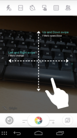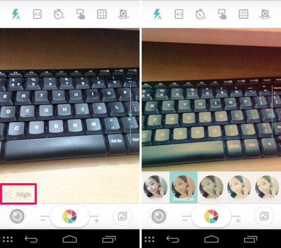 The controls to take picture, photo booth feature, and open gallery are located in the lower part of the app while finer controls, such as flash, aspect ratio, times, tap to capture, grid, and switch to the front camera areis located on a strip on the top of the interface. Tap on the ‘origin’ button to view filters. They will be shown as seen here, simply tap on them to get a live preview.