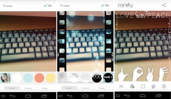 Candy Camera for Android also provides you with the option to add frames to the images that you capture. You are provided with three categories of frames, which include simple, pattern, and thema. The frames which come in this app are really amazing and creative. Below are some examples of these frames.