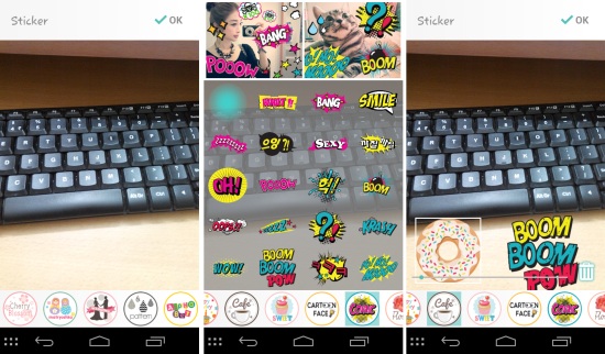 Next to the frames button is the stickers button. When you tap on it, you will have the interface as seen here. Simply tap on the stickers you like from the bottom of the strip to use them on your images. After you are done with the stickers, simply tap the ‘OK’ button.