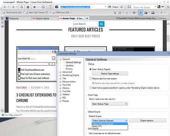 Interesting functionality that’s found in Lunascape is the ability to render web pages using 3 different rendering engines from within a single web browser.
