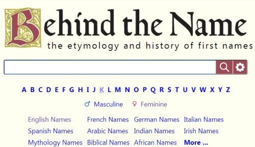 This website does what its name suggests, behindthename.com, it tells you the origin and history behind a particular name. You can search for names by letter, male, female, or according to country like English, Spanish, French, etc. When you search each name gets listed with a few details. These details include whether it is a male, female or unisex name; countries where it is used most, whether it is a modern or rare name, meaning of the name. When you click a particular name, it further opens in a windows with more details about the name like usage, pronunciation, meaning & history, popularity according to country. Then there are the regular features of name of the day, featured or popular names, message boards, etc.