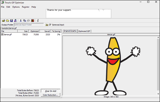 While it certainly doesn’t have the visual appeal like most other applications on the list, Trout’s GIF Optimizer makes up for it by the functionality it provides. It’s an extremely lightweight and fast GIF compressor application for Windows 10. You can simply import an animated GIF file, configure the optimization options, and Trout’s GIF Optimizer will take it from there. Want to optimize multiple images? Not a problem, as batch operation is supported too. Although the standard optimization settings work pretty well for a majority of animated GIFs, you can manually reduce the colors (by selecting one of the many preset color palettes available) for even more fine-tuned control. Based on the color reduction, varying degrees of compression can be achieved. What’s more, the Original Graphic and Optimized GIF tabs let you compare the two images to see the difference.
