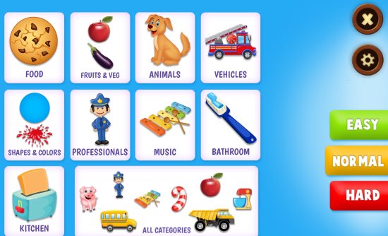 Spelling Game is a free fun app to teach kids how to spell. In this app when you start this app, you will be given a choice to choose a category to play from the given ones like animals, professionals, music, food, vehicles, shapes, colors, fruits and vegetables, etc. You can also choose a difficulty mode to play from easy, normal, or hard. When you choose a category an image will be displayed and the name of the object in picture will be spoken out loud by the app. Now you have to enter the name of this object in the picture using the jumbled letters on your board. Drag the letters to there right position and form a word. You can also use the hints option when you are stuck. The hints option is available on the left side of the screen with a bulb icon. You can go back to the home screen if you want to change the category you are playing under.