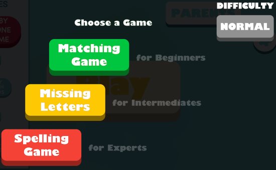 The matching game will show you a word which is not colored, along with that colored letters of the same word are given at the bottom in a jumbled up form. You have to drag these colored letters to there right positions in the word. When you move the words the background sound will read the letter out loud so you know how it is pronounced. The missing letters game you have to fill in the blank with the missing letter. In the spelling game you are shown an image of the object you have to name, then you are shown jumbled letters and blanks to be filled in.