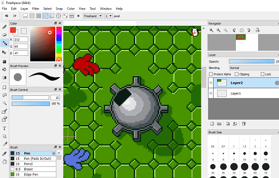 GrafX2 is a free and open source software for bitmap painting. And it is available for a lot of platforms including Android too. You can get it for Windows and then start using it on your PC. There is a portable version of this software available too. After getting it, simply open it and start creating your art. All the drawing tools are at the bottom of this software. Just select any tool and start drawing. You can add and remove as many layers as you want and then draw on them. Also, there is a button to clear the whole screen at once.