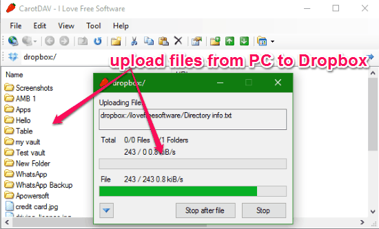 When you’re all set with connecting both your PC and Dropbox, you can go ahead and start uploading files from PC to Dropbox. In order to upload files, simply browse the “PC” connection on CarotDAV and copy any of the files from your PC. You can also copy folders if you want for uploading. Now, browse the “Dropbox” connection and paste the copied files (or folders) to the root directory or any of the folders on Dropbox. This will automatically upload the files or folders to your Dropbox storage. In addition to Dropbox, you can also use it to upload files to Box, SugarSync, OneDrive, etc.