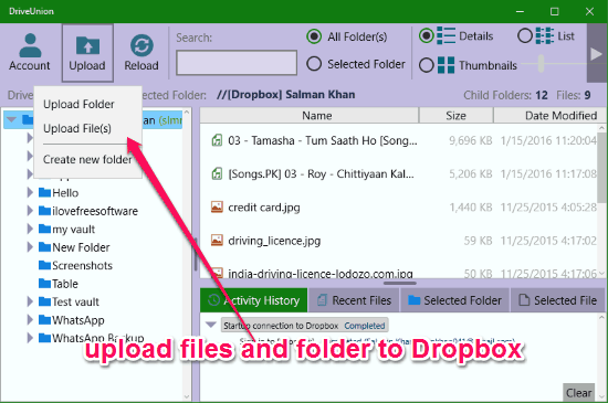 The last Dropbox uploader in my list is “DriveUnion” which is actually a free Windows app available for Windows 8, Windows 8.1, and Windows 10. It can also be used to upload your files from PC to Dropbox. After opening this app, simply select “Account → Dropbox” at the top and then enter your account details to connect Dropbox. After that, you can click on the “Upload” button at the top and then select whether you want to upload files or folders to Dropbox. As soon as you’re done with selecting the files or folders from your PC, it will automatically start uploading them to your Dropbox account.