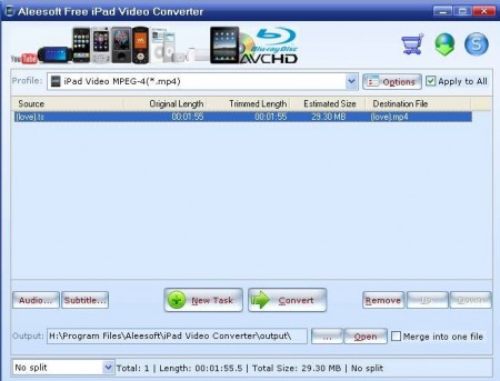 Aleesoft is powerful iPad video converter supporting almost any type of video formats and converts them into iPad video format, so that you can enjoy your videos on your iPad. It converts high definition video such as HD TS, HD AVI, HD WMV, HD MOV, HD MPG, HD MKV, HD MP4 to iPad HD video format, without compromising the quality output. You can do iPad video conversion job in batches with Aleesoft, this will save your time.