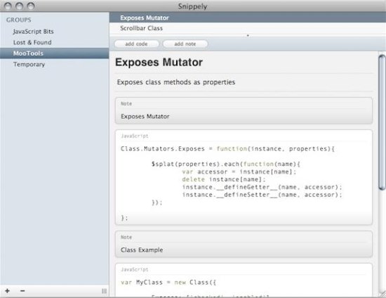 Snippely is a free text and code organizer tool that lets you save and organize all your code snippets at one convenient place. It’s a handy and lightweight app build on Adobe AIR platform, and currently supports JavaScript, CSS, PHP and Ruby.
