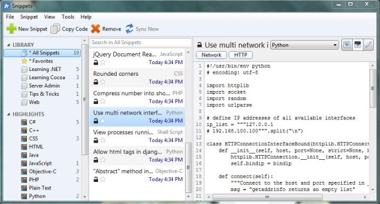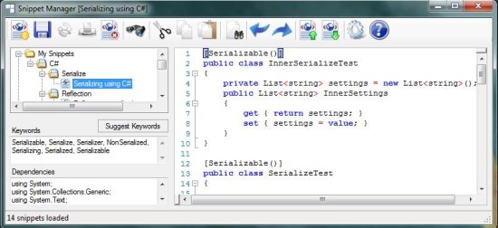 Next in the list is, The Snippet Manager, a small yet feature-rich tool to easily manage code snippet library. It comes with a user friendly interface and provides a favorable environment to store code snippets in a variety of languages including C, C#, C++, Java, PHP, and lot more!