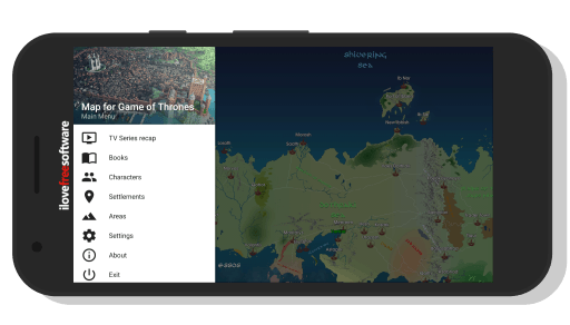 Map for Game of Thrones Free is a Android app where a interactive GOT map is available to recap all the episodes. The map covers all the locations ever released in the TV show or the books. You can easily tap on any location on the map and read more about it, that is why the map is called interactive. You can get detailed information on books, characters, areas, etc. Click on the three bar icon you see on your screen, you will see a menu come up like the one seen in the screenshot above. From this menu you can choose what you want, like TV series recap, books, characters, settlements, areas, etc.